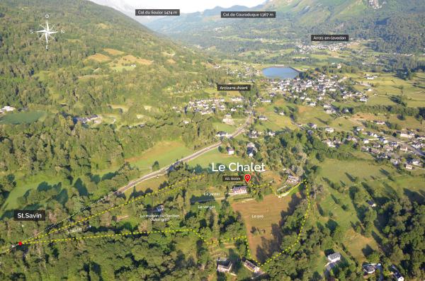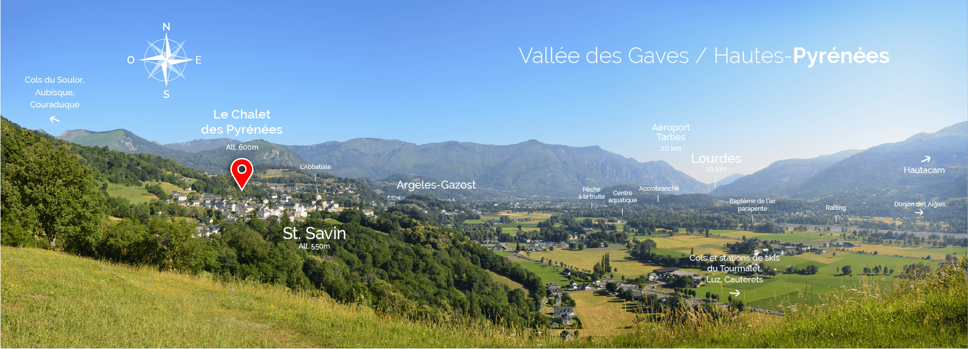 Le Chalet des Pyrénées is located in Saint Savin, a village nestled in the Vallée des Gaves in the Hautes-Pyrénées, 3 km/2 miles from Argeles-Gazost, 15 km/9 miles from Lourdes and 20 km/12 miles from Cauterets, Pont d'Espagne, and Hautacam. Central located in the valley, explore the countryside by foot, bike or ski from the holiday home. Trek the mountain passes and discover lesser-known paths of the Pyrenees National Park.